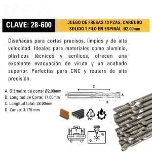 Diseñadas para cortes precisos, limpios y de alta velocidad. Ideales para materiales como aluminio, plásticos técnicos y acrílicos, ofrecen una excelente evacuación de viruta y un acabado superior. Perfectas para CNC y routers de alta precisión.