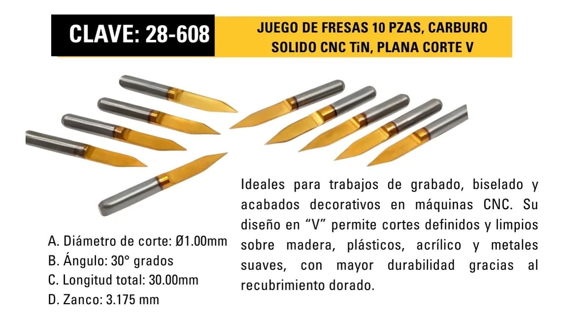 Ideales para trabajos de grabado, biselado y acabados decorativos en máquinas CNC.